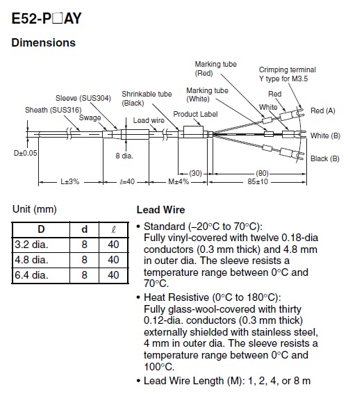 Sheathed Temperature Sensor, Platinum Resistance Thermometers Pt100, Exposed-lead Models (Crimping terminal Y type for M3.5), Temperature range: −196 to +450 ℃ (in dry air), Protective tubing (SUS316): 3.2 dia. x 150 mm, Lead wire: 8 m