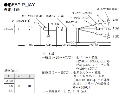 シース形温度センサ, 白金測温抵抗体 Pt100, リード線直出し形(M3.5用Y形圧着端子), 測温範囲 -196~+450℃(乾空気中), 保護管(SUS316): φ4.8mm×200mm, リード線 1m