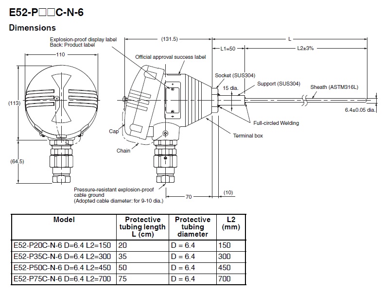 Explosionproof model Temperature Sensor, Platinum Resistance Thermometers Pt100, Enclosed-terminal model, Protective tubing: 6.4 dia. x 200 mm (L2: 150 mm)