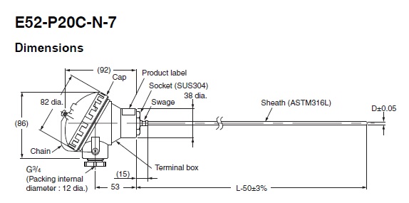 Double-element model Temperature Sensor, Platinum resistance thermometer Pt100, Enclosed-terminal model, Temperature range: -200 to +450 ℃, Protective tubing (ASTM316L (with sheath)): 6.4 dia. x 200 mm