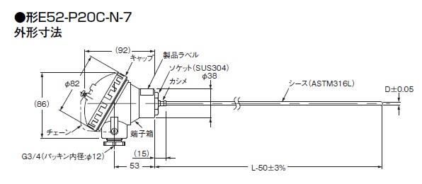 ダブル形(2素子)温度センサ, 白金測温抵抗体 Pt100, 端子内蔵形, 測温範囲 -200~+450℃, 保護管(ASTM316L(シースタイプ)): φ6.4mm×200mm