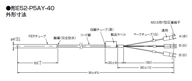 防水形温度センサ, 白金測温抵抗体 Pt100, FEPモールド形(完全防水), リード線直出し形(M3.5用Y形圧着端子), 測温範囲 -50~+180℃, リード線 6m