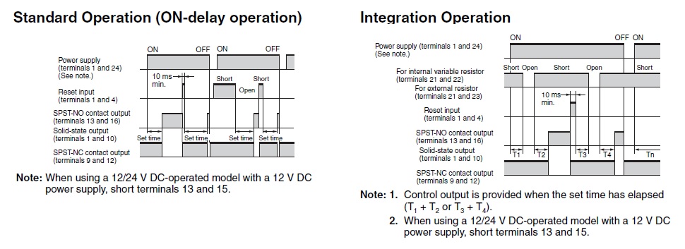 Solid-state Timer, No-Contact output (SPST-NO + SPST-NC), Time range: 1 s to 10 min, Time-limit operation/power-OFF resetting and external resetting, Integrating operation/power-OFF resetting and external resetting, 12/24 VDC