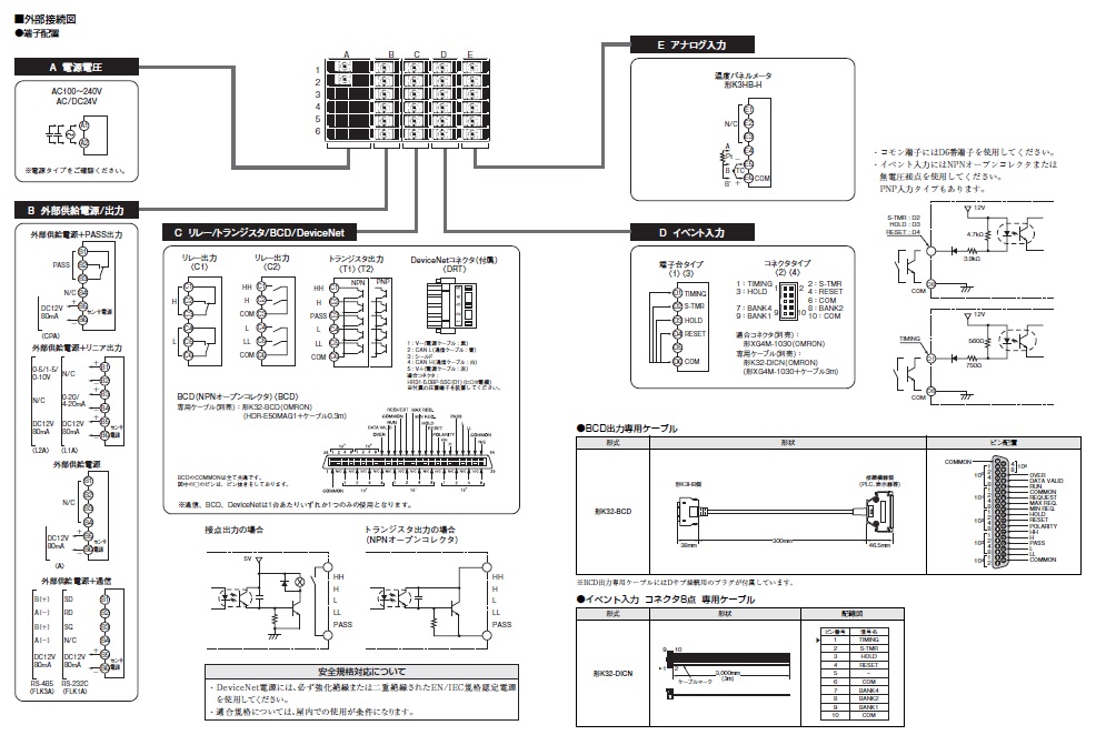 | 無接点 | ON時残留電圧: 2V以下 (タイミング入力は3V以下) 負荷電流: 4mA以下 (タイミング入力は17mA以下) 最大印加電圧: DC30V以下 OFF時漏れ電流: 0.1mA以下 (タイミング入力は1.5mA以下) | |