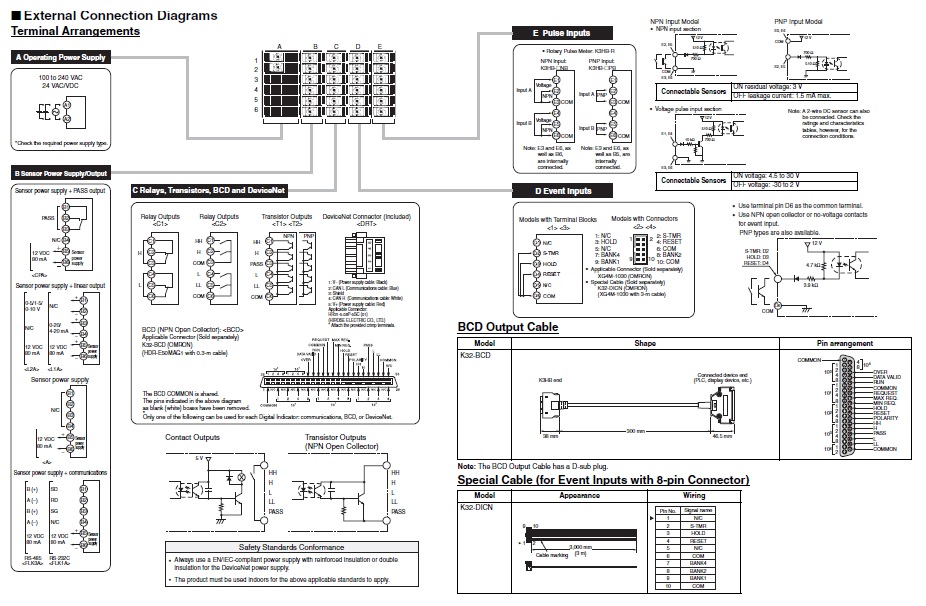 | BCD Output | Output signal name: DATA, POLARITY, OVER, DATA VALID, RUN/HH, H, PASS, L, LL Maximum load voltage: 24 V max.DC Maximum load current: 10 mA (DATA, POLARITY, OVER, DATA VALID, RUN)/50 mA (HH, H, PASS, L, LL) Leakage current: 100 µA max. | |