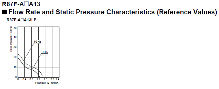 | Max. static pressure (Nominal value) | 50 Hz: 20 Pa 60 Hz: 24 Pa |