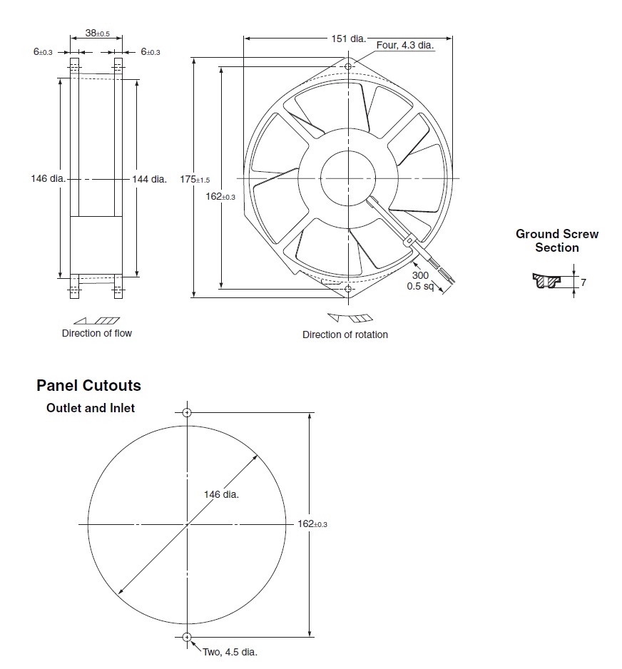 AC Axial Fans, Metal blades type, 150 dia., Frame thickness 38 mm, High speed, Lead-wire type, 230 VAC