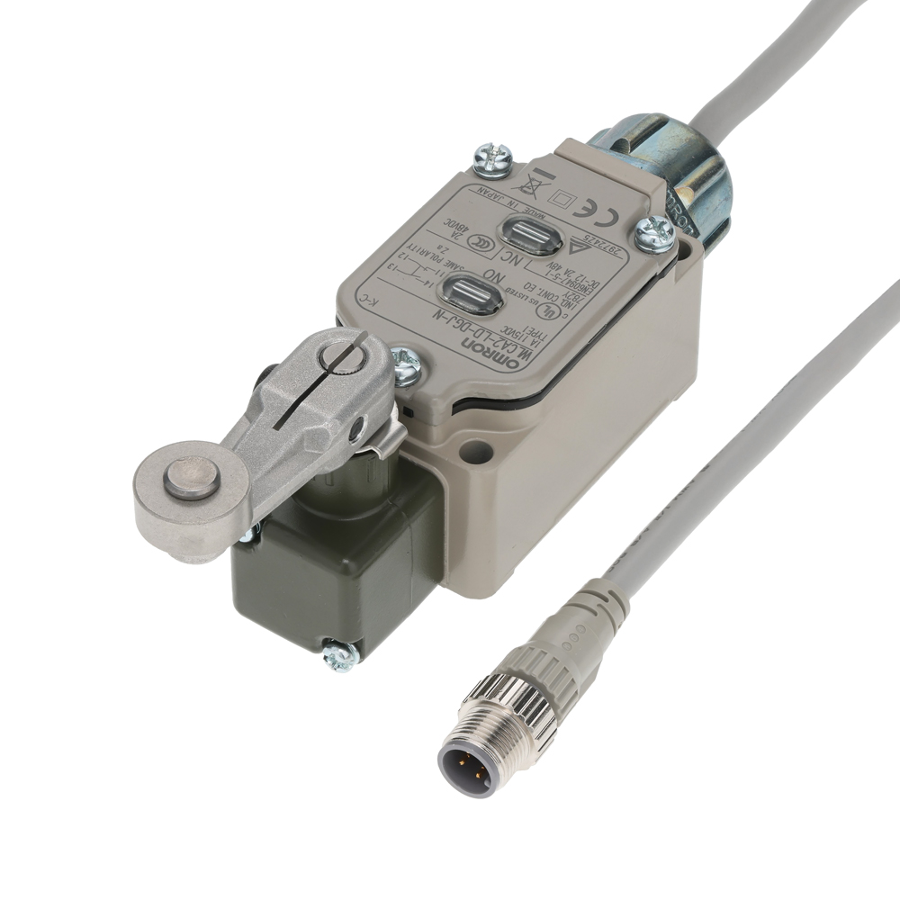 2回路リミットスイッチ, ローラ・レバー(R38), 動作までの動き(PT): 15±5°, 動作表示灯(LED)付き, プリワイヤコネクタタイプ(M12), 0.3m, DC電圧 NC+NO配線(NO③④/NC①②)