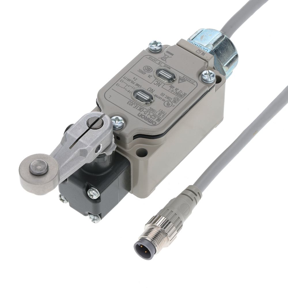 2回路リミットスイッチ, ローラ・レバー(R38), 高感度形, 動作までの動き(PT): 9~12°, 動作表示灯(LED)付き, プリワイヤコネクタタイプ(M12), 0.3m, DC電圧 NO配線(NO③④/NC②)