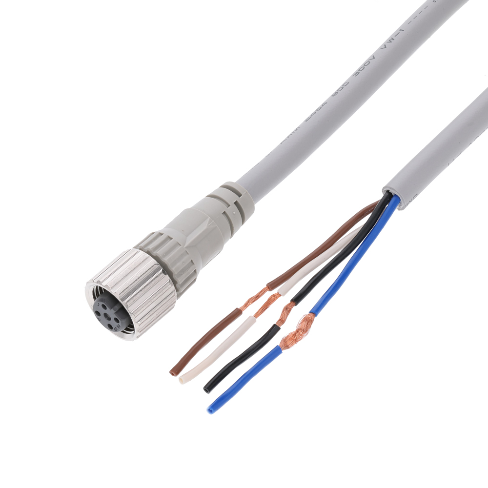 Round Water-resistant Connector (M12 Threads), Connector with cables, socket on one cable end, For AC, 4 poles, Gold plating, Straight, Connections: ①Brown/②White/③Blue/④Black, Fire-retardant PVC robot cable, 2 m