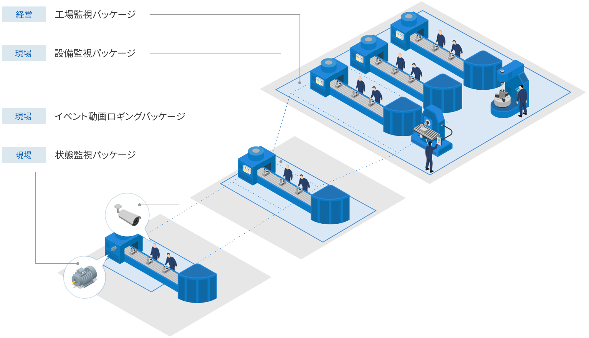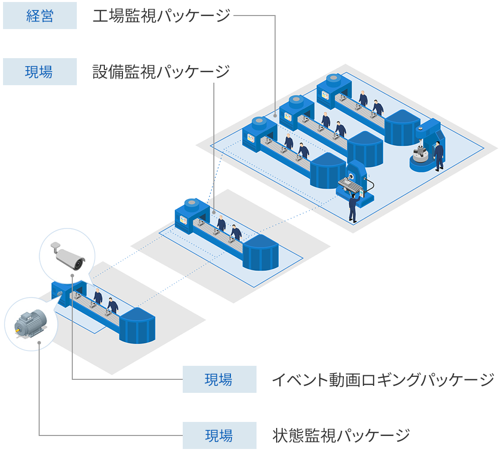 4つのパッケージを連携させることで、工場全体から設備・機器までを同じ時系列で可視化し、KPIと現場の動きをつなげます。