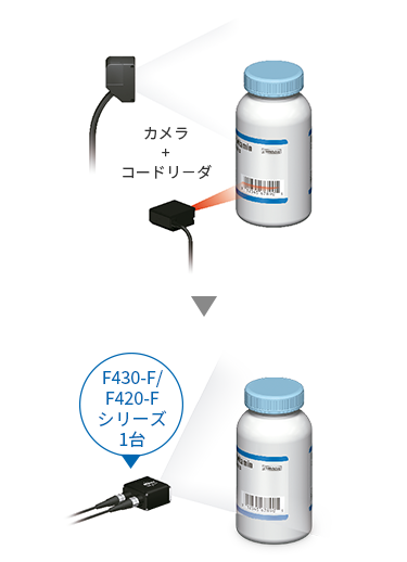 F430-F/F420-Fシリーズはコード/文字読取り機能があるので、1台でシンプルに検査とコード/文字読取りができます。