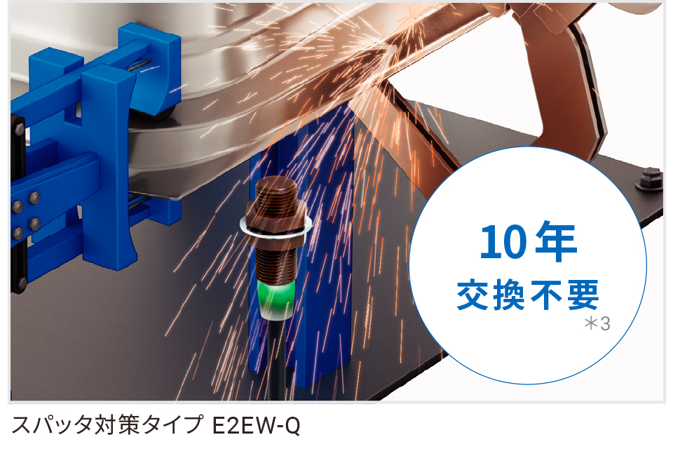 - *3 当社で想定した「アーク溶接環境下で1 日10 時間稼働し、清掃頻度を月1 回(年間12 回)」とした場合の想定値です。当社従来品(E2EF-Q)が清掃3 回に1 回の交換とすると、E2EW-Q は清掃180回に1 回の交換となるため、10 年以上交換不要となります。