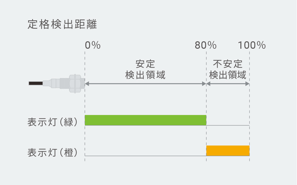 2線式も2色の表示灯を搭載しています。安定領域では緑点灯、不安定検出領域では橙点灯となり、安定検出できているかを見た目で確認できます。