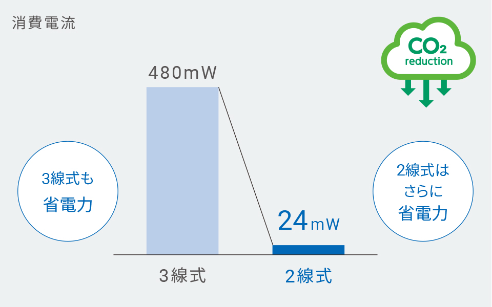 オムロン独自のノイズ抑制技術を搭載することで低消費電力での長距離化を実現。さらに2線式であれば消費電力を1/20に削減できるので、環境にやさしい設備設計が可能です。