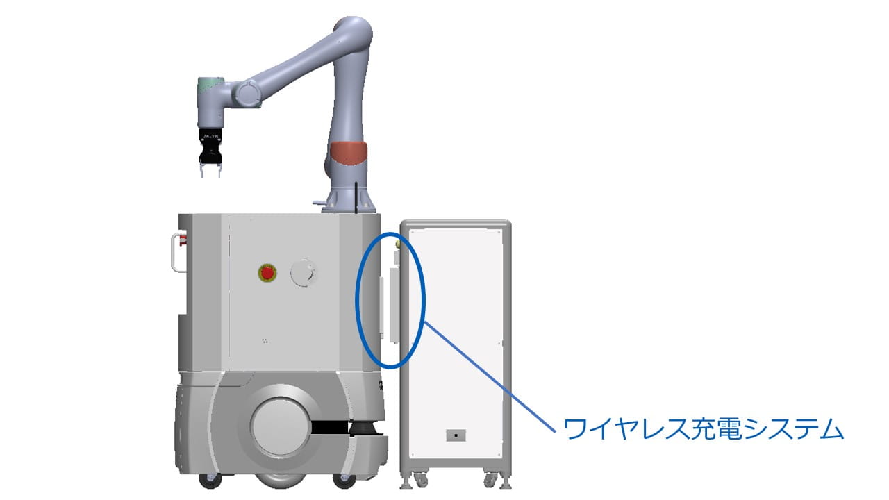 モバイルマニピュレータの側面にワイヤレス充電システムを設置。