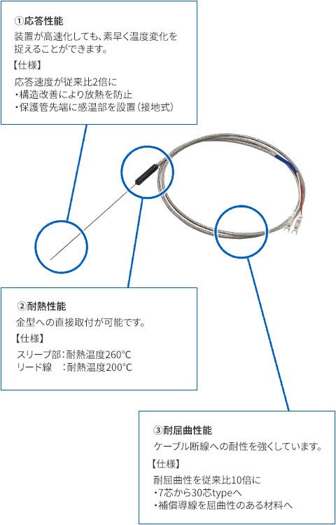 補償導線部の耐屈曲性に優れており可動部でも使用いただけます。