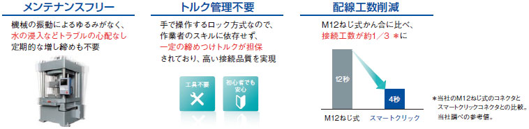 ・1/8回転で接続完了。スマートクリック仕様により作業時間を劇的に短縮します。