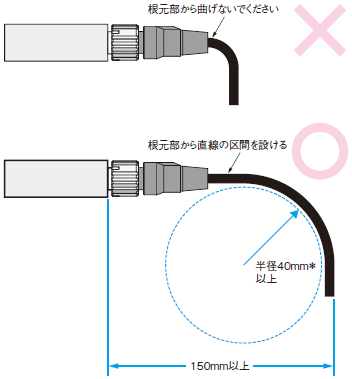 ・ケーブルを曲げる場合は半径を40mm *以上でご使用ください。