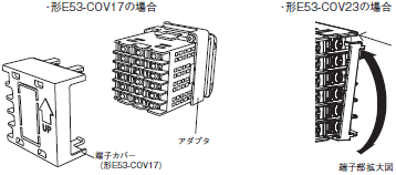 端子カバー 形E53-COV23を下図のように端子カバーをたわませながら端子台へ取り付けてください。逆方向には取り付けられません。また、端子カバー 形E53-COV17も使用できます。