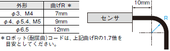 センサのコードの根元から曲げた場合に、コードの表面に付着している樹脂がはがれる場合がありますが、保護構造および検出性能に影響はありません。できるだけセンサの根本から10mmは曲げないようにしてください。
