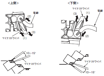 • リリースホールにマイナスドライバを押し込むときは斜めにして入れてください。まっすぐに入れた場合は端子台が破損する恐れがあります。