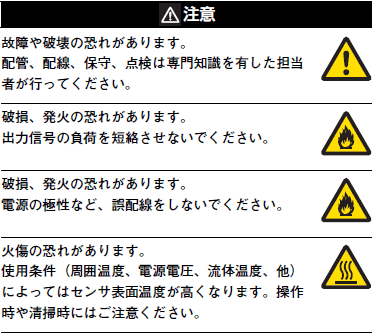・センサの設置・交換時は、装置の停止や流体の除圧をして頂く等、安全をご確認された上で行ってください。