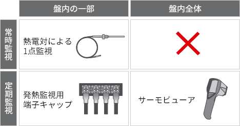盤内の一部しか点検できないため、盤内全体の状態を常時監視できない