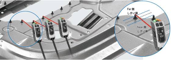 ワークの位置を基準に、Near 側しきい値、Far側しきい値をワンタッチで同時設定。所定の位置におけるワークの有無検出のしきい値を簡単に設定できます。