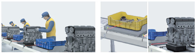 ワークの色によって、検出距離が変わり、検出が不安定になることがありました。E3AS-F は、TOF 方式で色の影響を受けにくく、コンテナの色が変わっても、エンジンブロックでも同じ設定距離で安定検出できます。