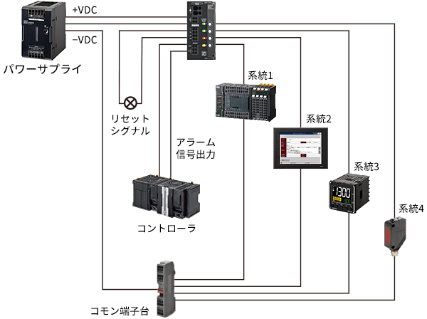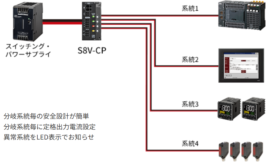 DC電子式サーキットプロテクタ「S8V-CP」は各系統の異常発生時、アラーム信号出力で上位のコントローラに出力することが可能です。