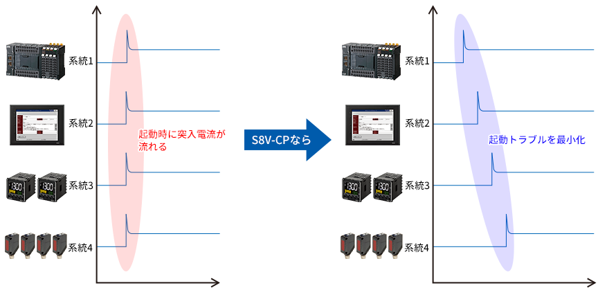 DC電子式サーキットプロテクタでは、起動時に分岐系統ごとに順次起動させることで、分岐系統毎の突入電流を分散させ起動時の突入電流による起動トラブルを最小化します。