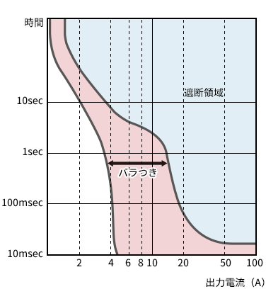 メカ式のサーキットプロテクトは遮断の動作特性にバラつきがありましたが、DC電子式サーキットプロテクタ「S8V-CP」では遮断の動作特性のバラつき誤差が少なく確実に遮断します。