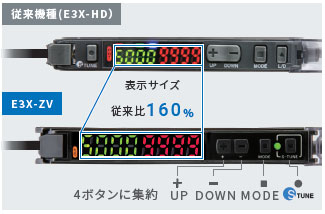 使用頻度が低く、意図せずに押してしまうことで誤動作の原因になるというお客様の声を受け、従来機種に搭載されていたLight on / Dark on切替ボタンを無くしました。これによって部材コストを低減させるとともに、大きな表示スペースを確保し、視認性が向上しました。