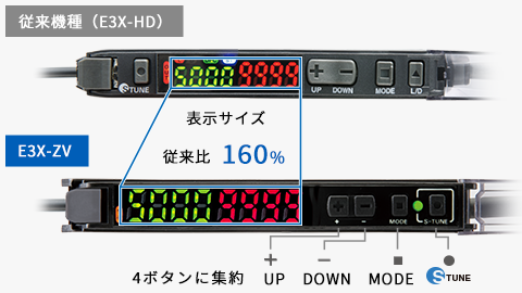 使用頻度が低く、意図せずに押してしまうことで誤動作の原因になるというお客様の声を受け、従来機種に搭載されてたLight on / Dark on切替ボタンを無くしました。これによって部材コストを低減させるとともに、大きな表示スペースを確保し、視認性が向上しました。