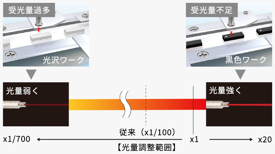 高いダイナミックレンジ(E3X-HD比7倍)を有しており、黒いものから光沢のあるものまで安定検出します。十分に光量を下げることで、背景が光沢面でも光量飽和しません。