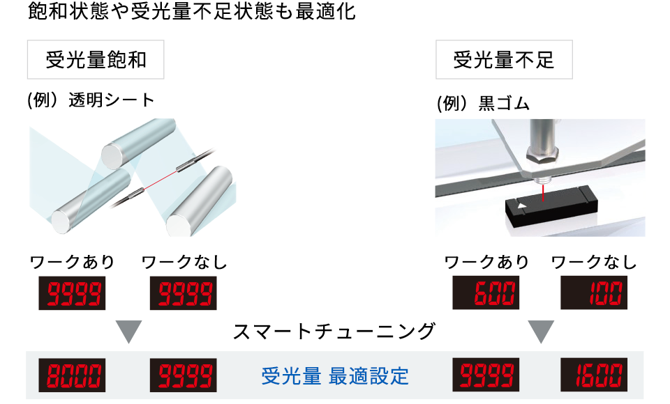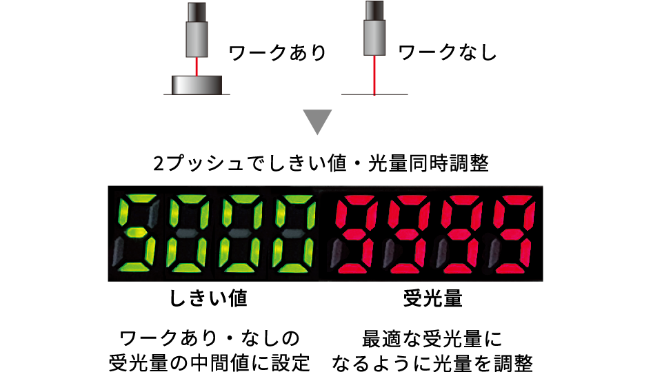 ボタンを2回押すだけで光量としきい値を最適条件に調整できます。ワーク、取付条件によらず操作が共通なので、設定方法も統一することができ、作業者によるばらつきもありません。