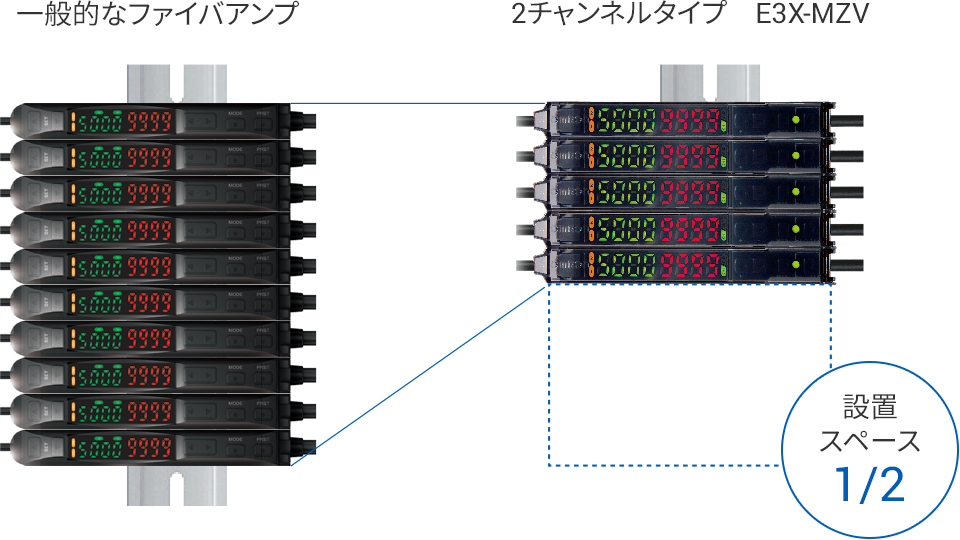 2台分のアンプ機能を搭載した2チャンネルファイバアンプなら、必要な台数がこれまでの半分で済むため、購入コストを大幅に低減できます。さらに配線工数・消費電力を大きく削減できるほか、装置や制御盤の小型化に大きく貢献します。