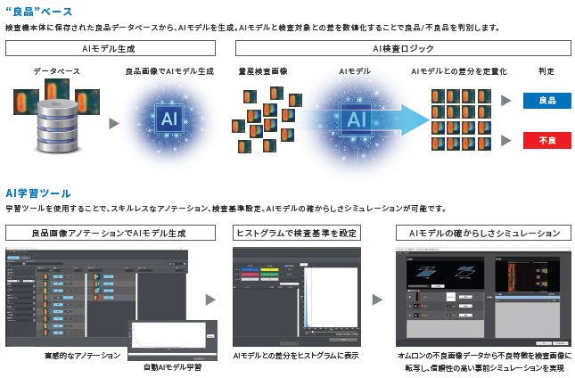 検査にAIを活用する際の「万が一見逃しが発生したら…」や「膨大な学習データが必要なのでは?」といったお客様の不安に対し、オムロンでは、安心してお使いいただける様々なAIツールの拡充を進めています。従来の属人的な官能検査をAI判定でスキルレス化し、検出力強化や虚報、目視工数を削減することで、生産性向上に貢献します。