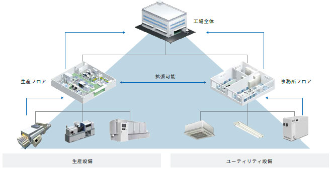 まずはエネルギー使用が多い設備・装置から見える化し、次にラインやフロアごとに拡大。最終的に工場全体の見える化システムとしての運用も可能です。
