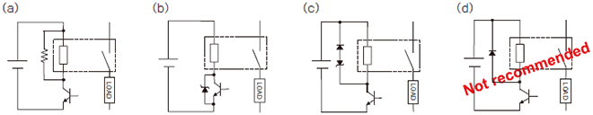 コイル駆動回路にサージキラーを接続することによってコイルのサージ電圧抑制・駆動回路保護の効果がありますので、下記に示す代表例(a)、(b)、(c)を回路設計上の参考としてください。また、(d)のような回路においては復帰時間遅延によりリレーの性能が著しく低下する可能性がありますので、必ず実負荷にてご確認の上、ご使用ください。