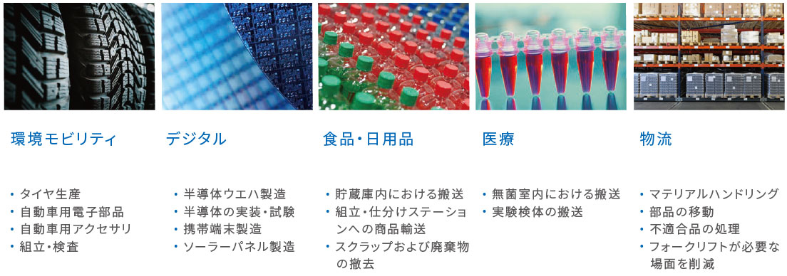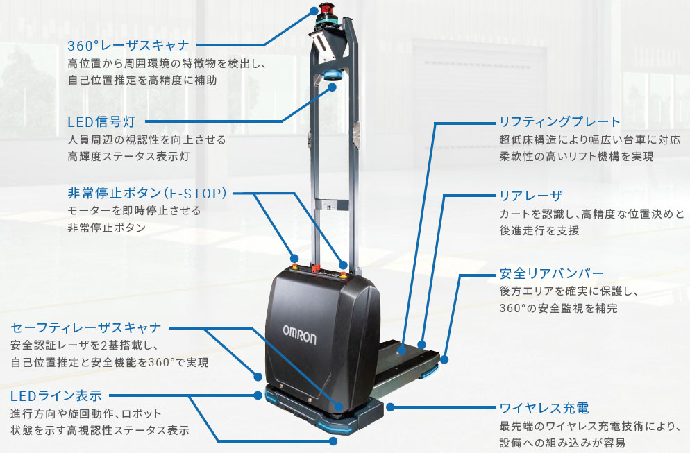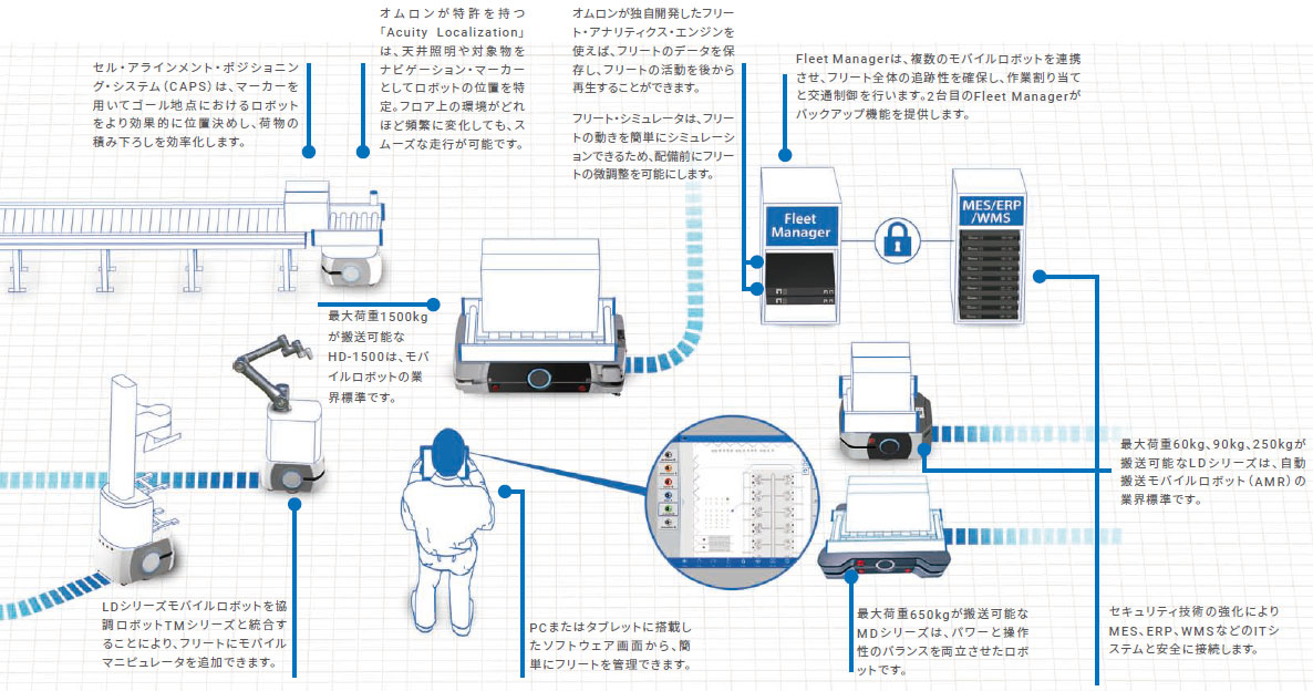 モバイルロボットのほか、制御用部品から視覚センサ、コントローラ、サーボモータ、安全機器や従来型の産業用ロボットまで、他に類を見ない多様な自動化関連機器やデバイスの品揃えを用意しています。