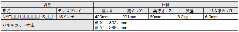 以下に15インチディスプレイパネルPCの寸法と質量に関する仕様の詳細を示します。