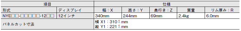 以下に12インチディスプレイパネルPCの寸法と質量に関する仕様の詳細を示します。