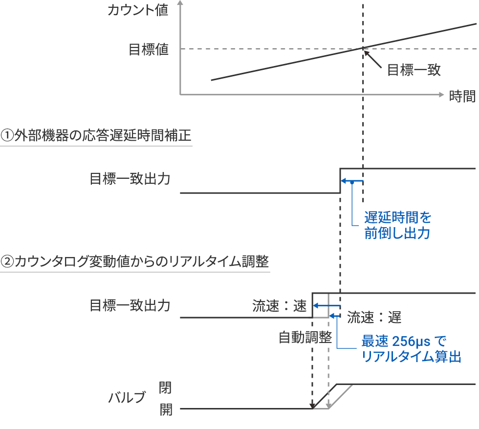 カウント値が目標値と一致したタイミングでバルブ閉信号を出力すると、実際にバルブが閉じ切るまでの遅延により充填量が過剰になります。