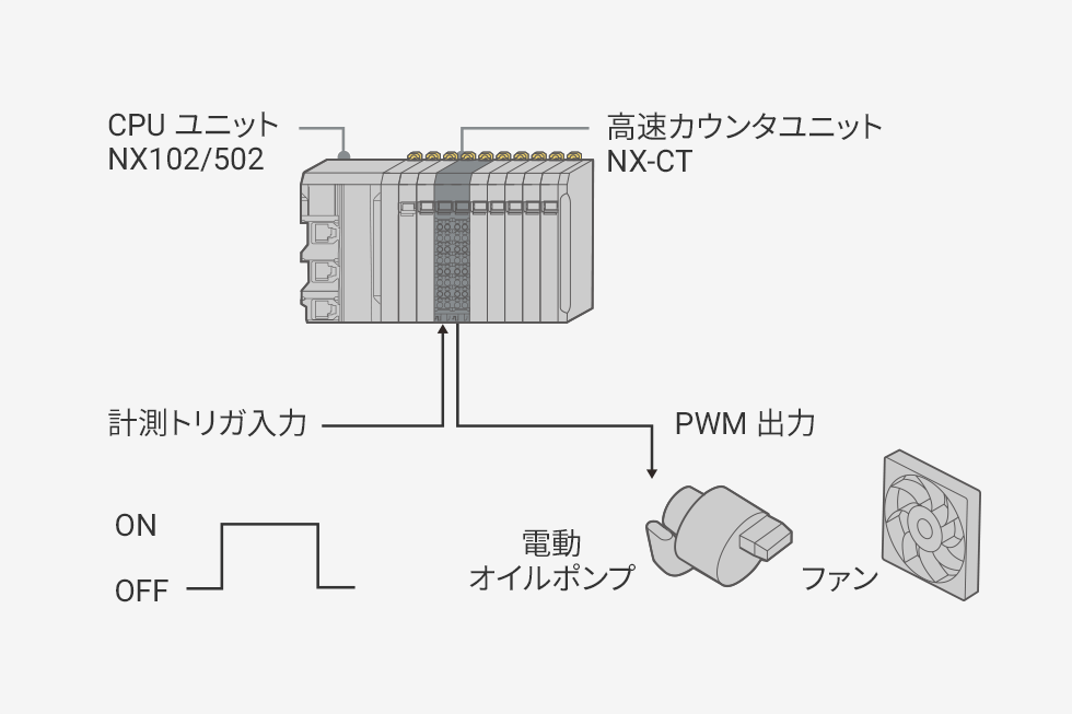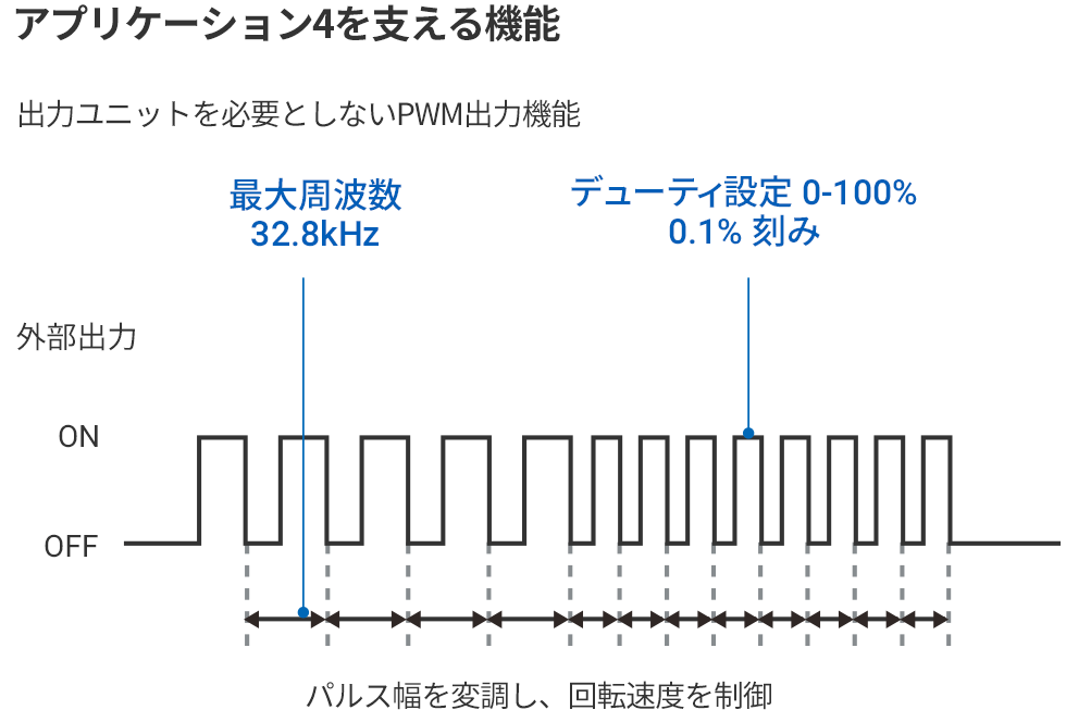 NX-CTは、PWM出力機能を搭載し、出力のON/OFFや0.1%刻みのデューティ設定が可能です。専用PWM出力機器を用いずに検査ができ、設計工数削減、省スペース化、省コスト化に貢献します。