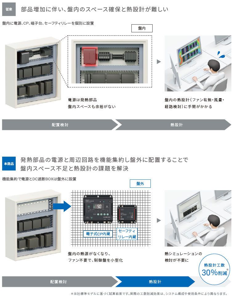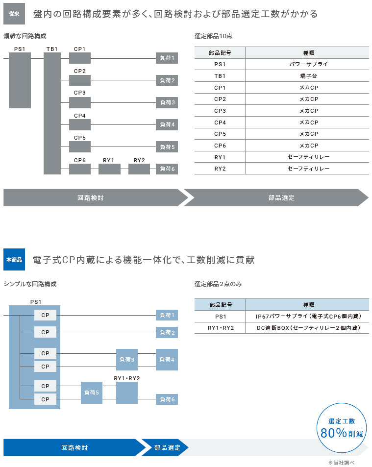 電子式CP内蔵のIP67パワーサプライに加えて、DC遮断BOXにより、電源回路と安全回路を盤外で省工数に構築できます。