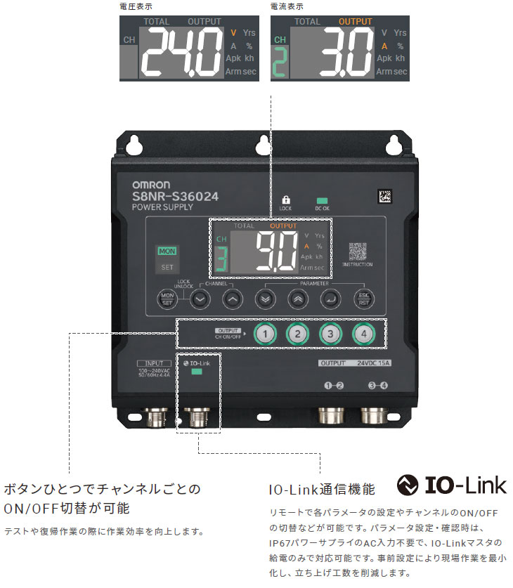 さらに、 IO-Link通信により、電源本体での設定変更やチャンネルON/OFF切替キー操作を無効化することができます。モニタモードでの表示切替とキーロックのみ操作できます。