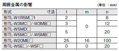周囲金属物に対しては、下表の寸法以上離してご使用ください。