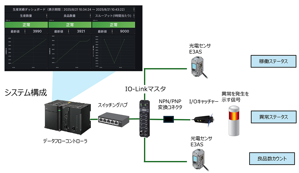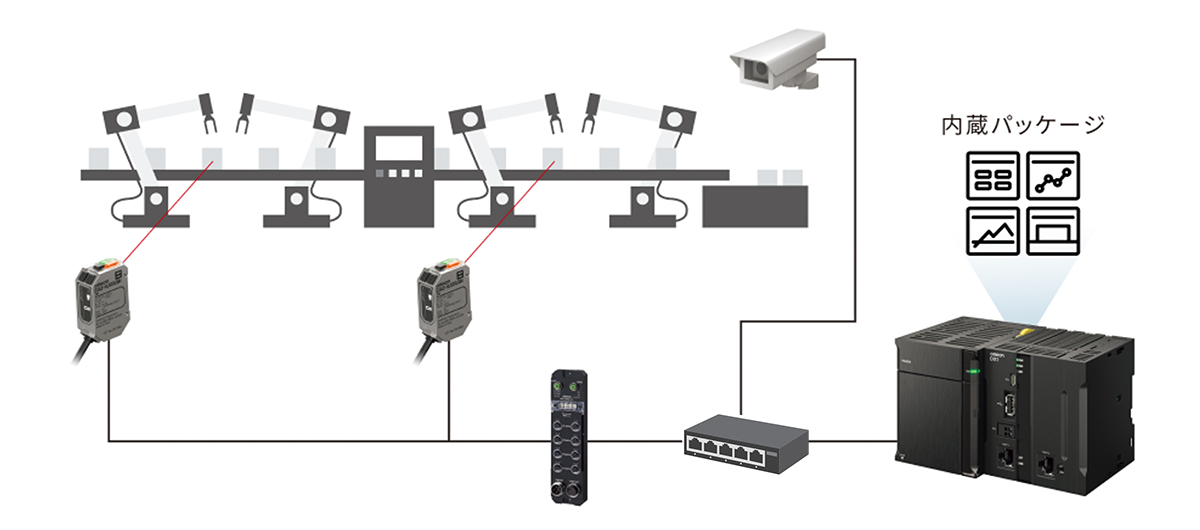 「設備監視パッケージ」では、指定したセンサを取り付けるだけで、各装置の稼働データをリアルタイムに自動収集して蓄積します。 ライン上でのワークの流れや停止を検知し、設備ごとのOEE、良品率、サイクルタイムなどを自動算出して、グラフ化して表示します。 専門的なプログラミングや複雑な設定を必要としない、直感的な操作で設備ごとの生産実績データを取得可能な仕組みを構築できます。